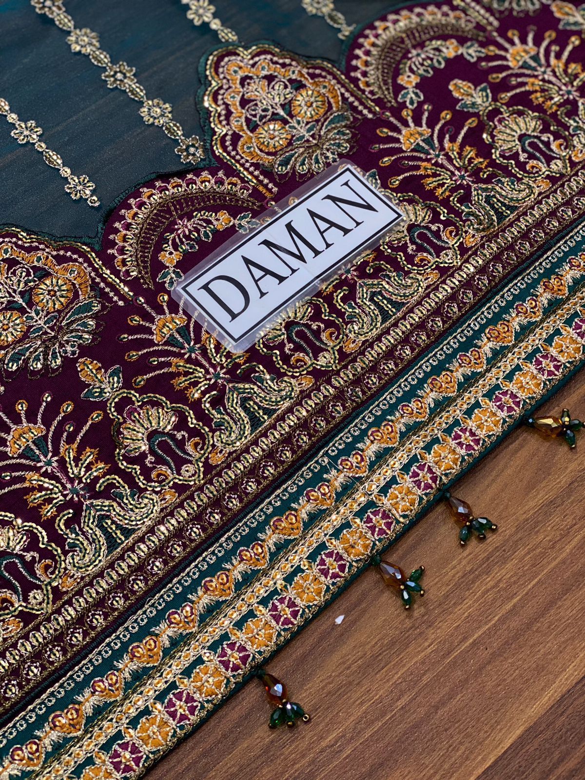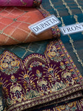 The sleeves are beautifully crafted with sequence embroidery and pearl (pulse) embellishments on the cuffs, while the back remains plain for a refined balance. The look is completed with a double-shaded embroidered organza dupatta, showcasing 4-sided embroidered borders for a truly regal appeal.