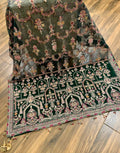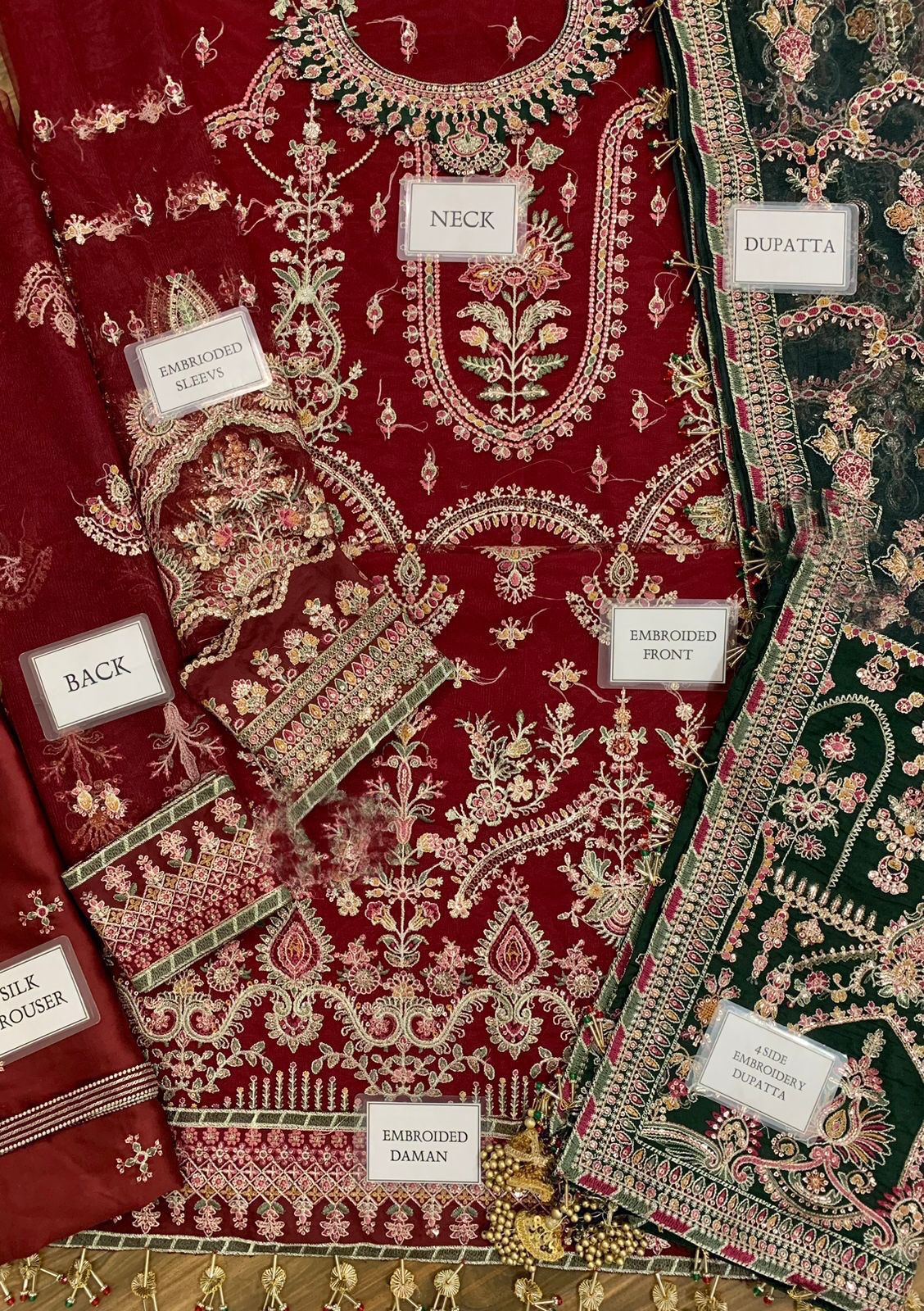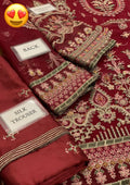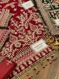Adding to the elegance, the organza dupatta is fully embroidered with four-sided spangle work borders and fancy tassels on all sides, along with two embroidered pallou borders, giving it a complete luxury look. The shamos silk trouser comes with heavy embroidered lace and spangle detailing, completing the outfit with a sophisticated touch.