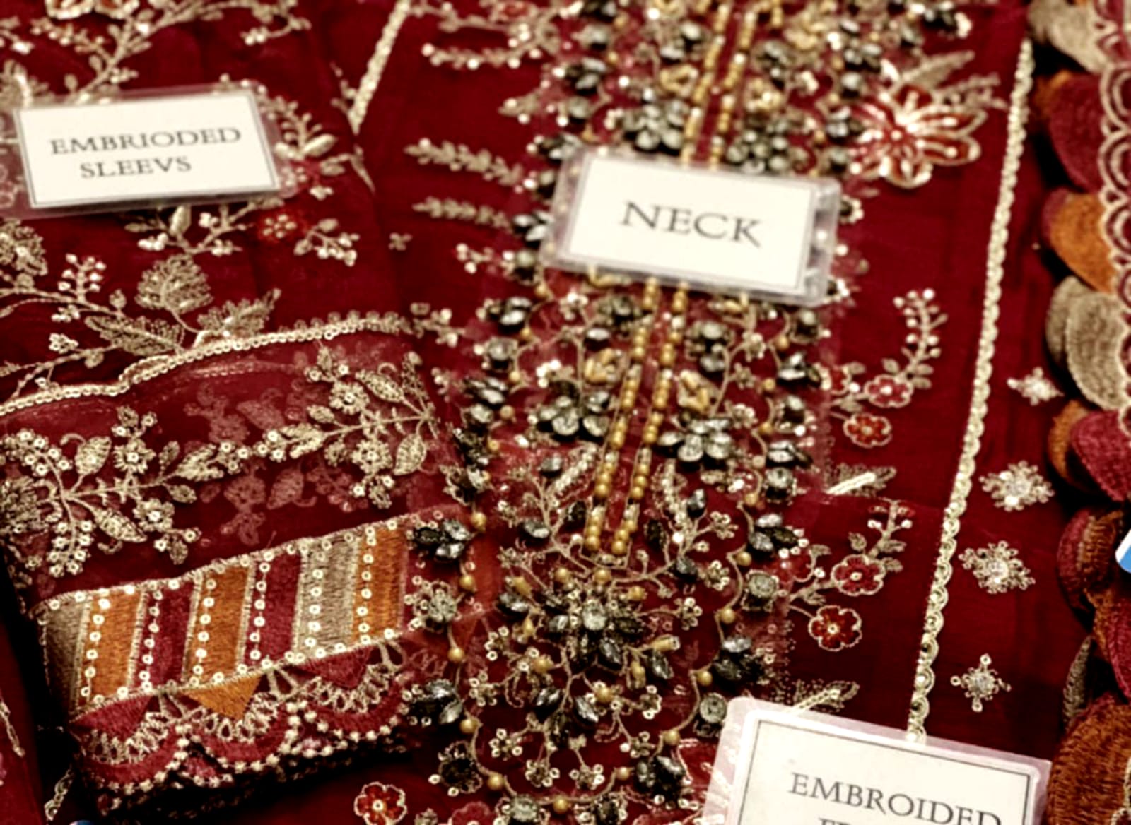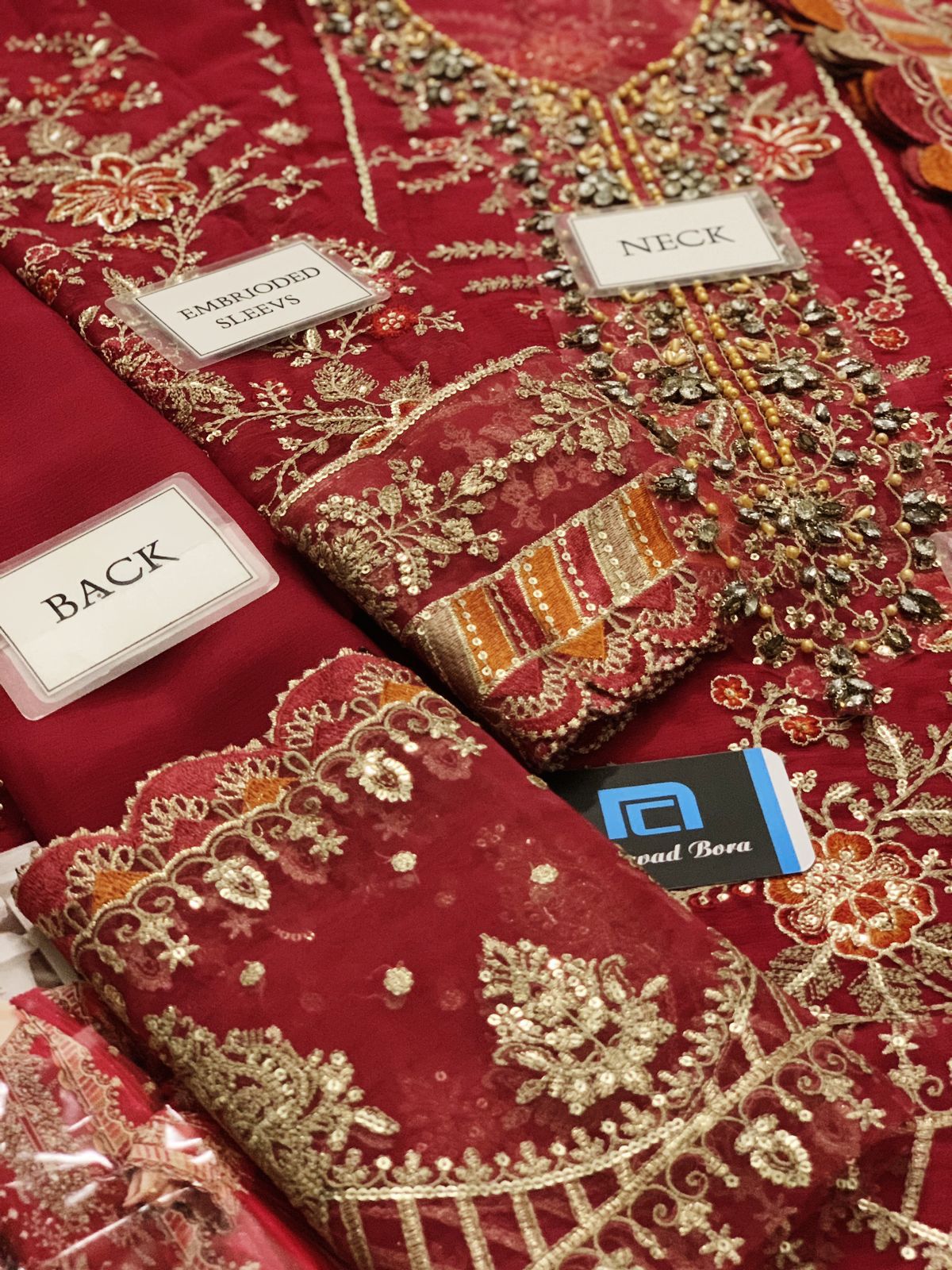 Sleeves: Chiffon fully embroidered with spangle work, finished with embroidered sleeve borders.