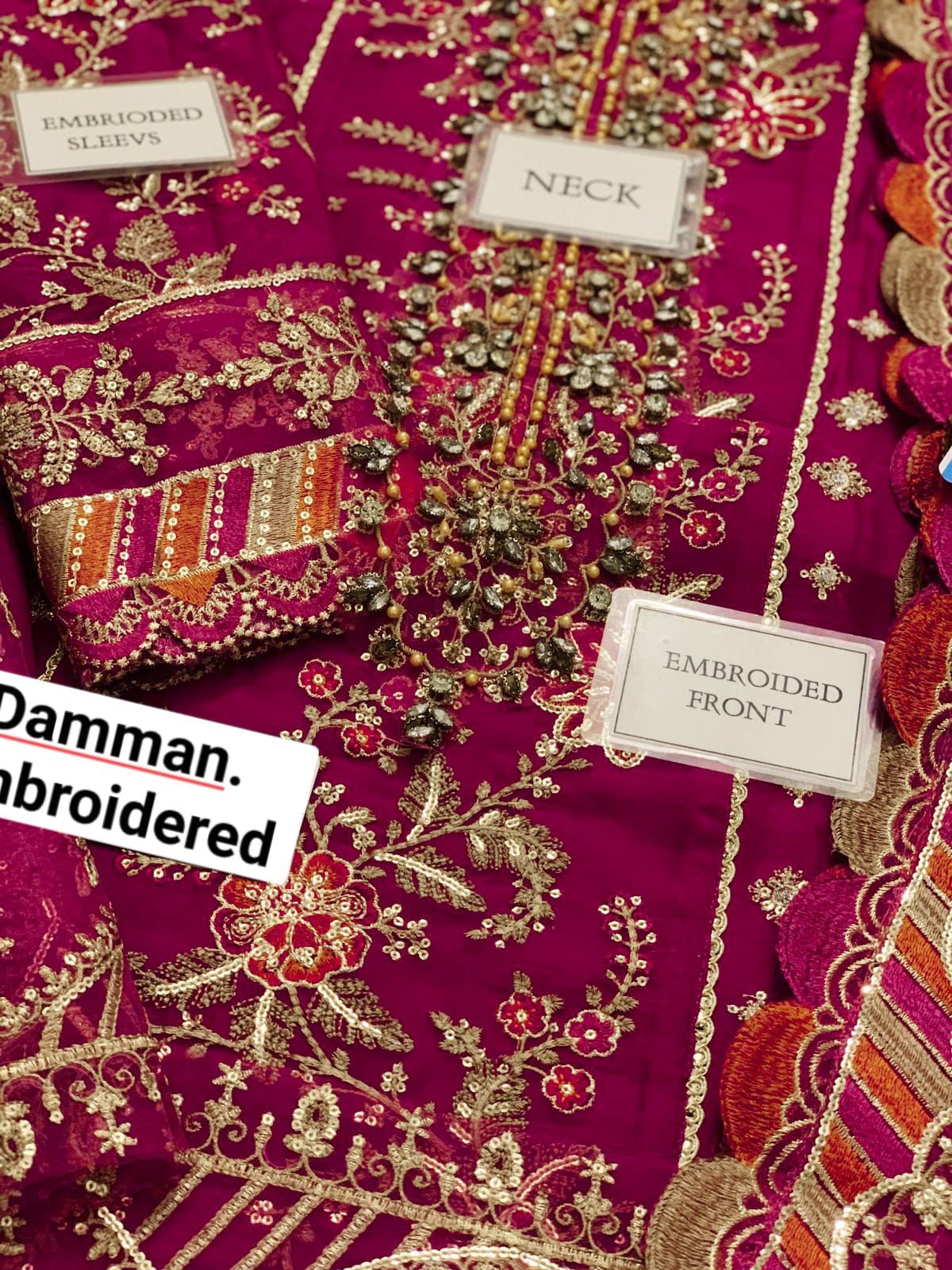 Introducing Maria.B’s most hit design – Article MBC-1098, a masterpiece of craftsmanship and elegance. Designed on semi pure chiffon, this suit reflects timeless beauty through spangle embroidery, adda hand embellishments, and delicate detailing. Available in three stunning festive colors, it’s perfect for weddings, parties, and special occasions.